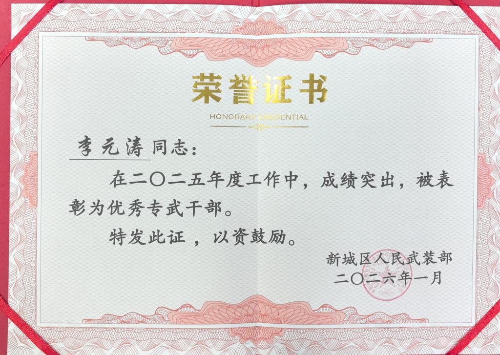 1 月 23 日,在中共新城区人民武装部委员会扩大会议表彰通报中,beat365武装部凭借扎实的工作成效、过硬的队伍建设,获评新城区人民武装部 “先进基层武装部”;学生工作部(武装部)部长李元涛荣获 “优秀专武干部” 称号beat365是唯一获两项荣誉的驻区单位。此项荣誉的获得,既是对beat365武装工作的高度肯定,是beat365深耕国防教育、抓实征兵工作的生动体现。
