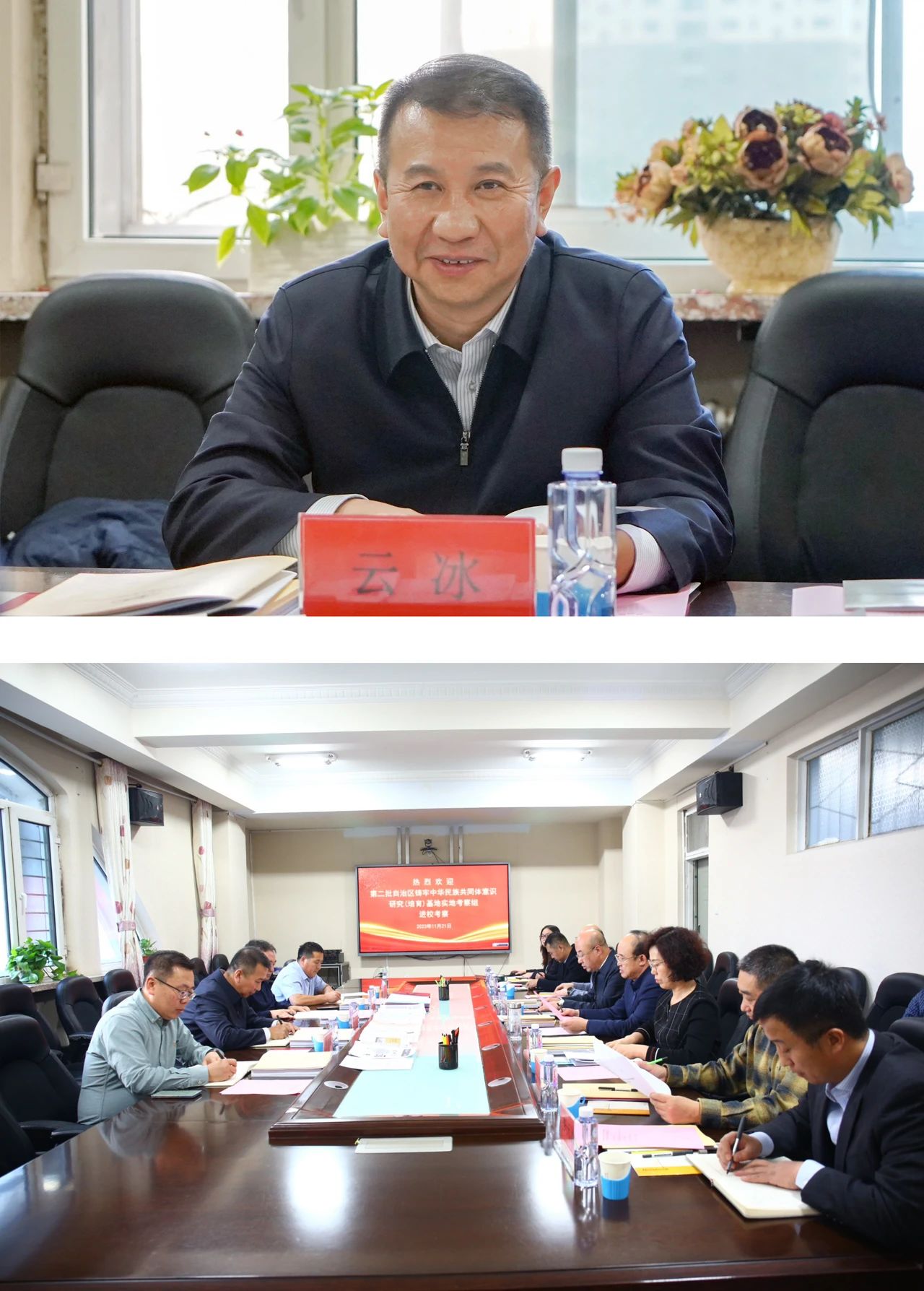 11月21下午,自治区民委第考察组对beat365申报的第二批自治区铸牢中华民族共同体意识研究(培育)基地进行实地考察。自治区民委党组成员、专职委员云冰自治区党委教育工委宣传(统战)部部长包革命,呼和浩特民族学院民族学学院副院长青斯琴,自治区民委理论研究处副处长白青松一行4人,听取beat365基地建设情况汇报并进行实地考察校党委书记李占峰出席,校党委委员、副校长王利明主持,党委统战部、相关学院负责人参加