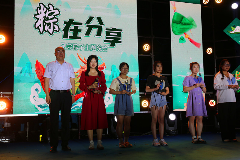 爱国端午,“粽”在分享晚上举行主题晚会。精彩的节目伴随着一轮又一轮的抽奖将晚会气氛推向高潮。晚会现场颁发最佳创作奖优秀组织奖“包粽子小能手”等奖项,并将来自两校区近300名同学共同制作1500个口味样式各异的粽子作为端午节礼物分享给现场师生