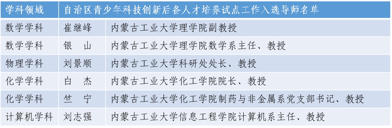 内蒙古自治区青少年科技创新后备人才培养,是由内蒙古科协、内蒙古教育厅共同组织实施的中学生科技创新后备人才培养计划,旨在促进中学教育与大学教育相衔接,建立行之有效的青少年科技创新人才培养模式,加快建设高质量科技创新后备人才培养体系,激发广大青少年的科研兴趣,为青少年科技创新人才不断涌现和成长成才营造良好社会氛围。