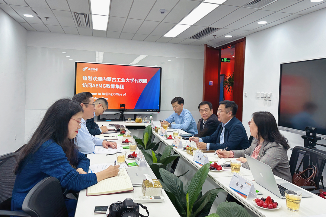 AEMG教育集团,郭洪飞一行会见集团董事长、总裁李新庆及相关工作人员。双方就申报中外合作办学项目、中外合作办学机构、引进优质教学资源等方面达成共识,明确后续合作方向。李新庆带领郭洪飞一行参观了AEMG教育管理集团的线上教室和学习中心。