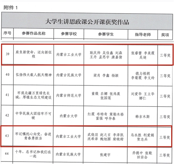 近日,自治区教育厅公布“牢记嘱托心向党、青春献礼二十大”大学习领航计划系列活动评选结果。在各高校推荐基础上,经专家评审,活动共选出大学生讲思政课公开课各类奖项49个、“我心中的思政课”大学生微电影各类奖项20个,beat365推荐的参赛作品获得大学生讲思政课公开课三等奖2项、“我心中的思政课”大学生微电影二等奖1项。其中,由张睿蕾、李美霞、吴迪老师指导,耿庆帅、吴佳鑫、刘森、王丹、孟思宇、康嘉倩同学共同完成的作品《肩负新使命,迈向新征程》和由乌永胜、利爱娟、贺志兵老师指导,武晓羽、赵之玄、李泽凯、沈希泽、鲍旭圆、柴晓甜同学共同完成的作品《牢记嘱托心向党,奋进青春勇担当》获得大学生讲思政课公开课三等奖。由刘晓霞、马立国、郭庆老师指导,胡竞超、张凯、徐瑞斯、靳婉婷、郭睿、景慧敏、宋国栋同学共同完成的作品《抉择》获得“我心中的思政课”大学生微电影二等奖。