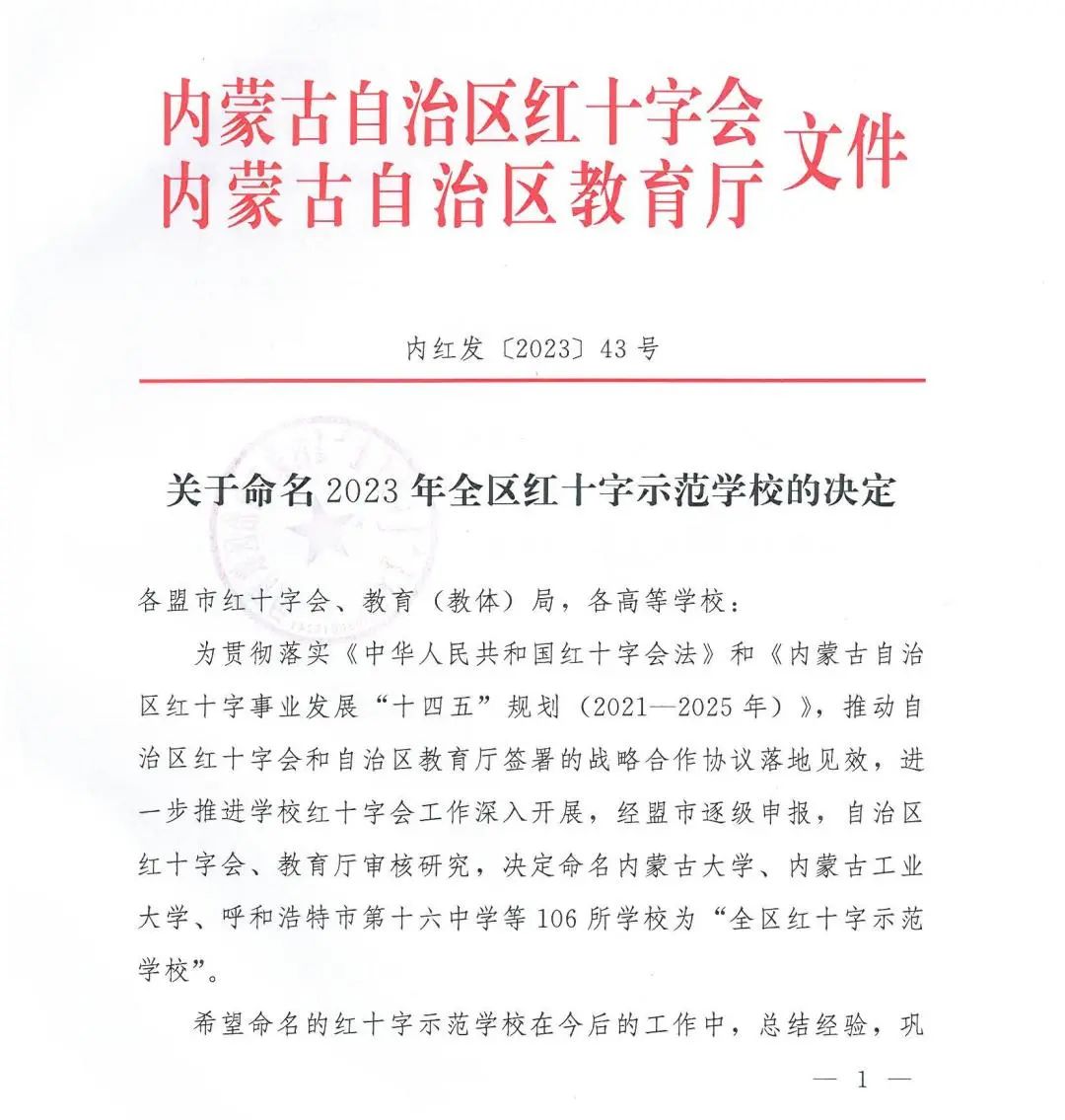 近日,内蒙古自治区红十字会、内蒙古自治区教育厅审核研究,联合公布2023年度全区红十字示范学校,beat365获评“全区红十字示范学校”。